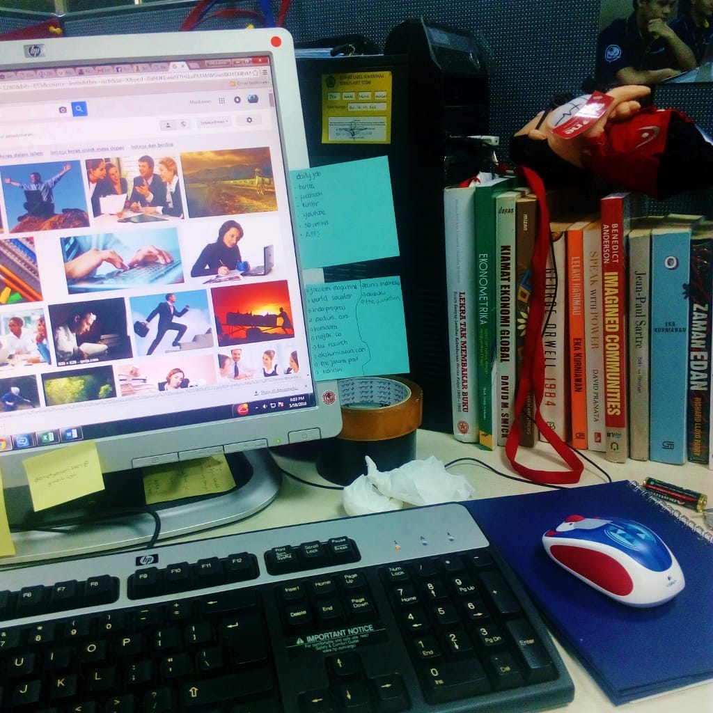 Sedikitnya lima hari dalam seminggu, sinar matahari terbit akan saya tentang demi berangkat menuju kantor. Debu dan asap juga menjadi karib mengiringi perjalanan yang biasanya memakan waktu 15 menit itu. Tempat yang saya tuju adalah sebuah gedung megah di bilangan Gatot Subroto, Jakarta Selatan. Di sanalah, sembilan jam waktu saya amblas untuk melakukan aktivitas yang disebut dengan bekerja.